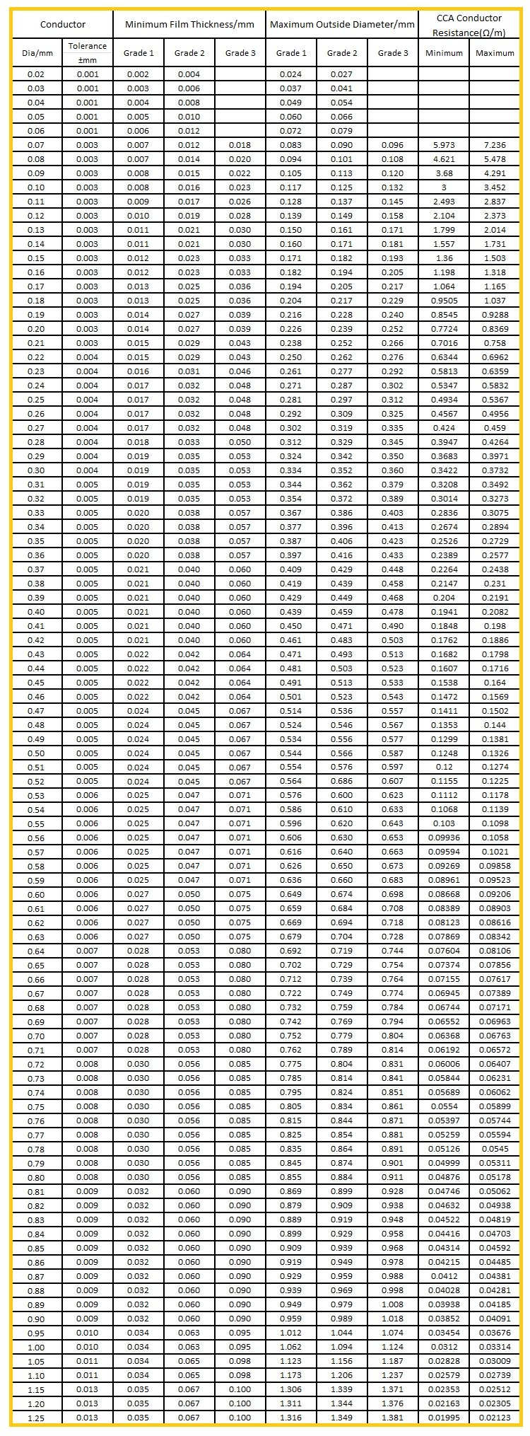 2, DIMENSIONAL TABLE OF ENAMELED CCA ROUND WIRES