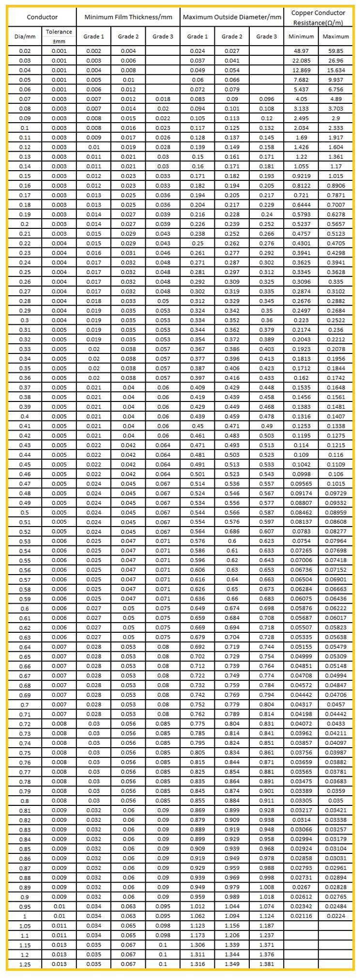 | Conductor Size | 0.02 – 4.00 mm in diameter. |