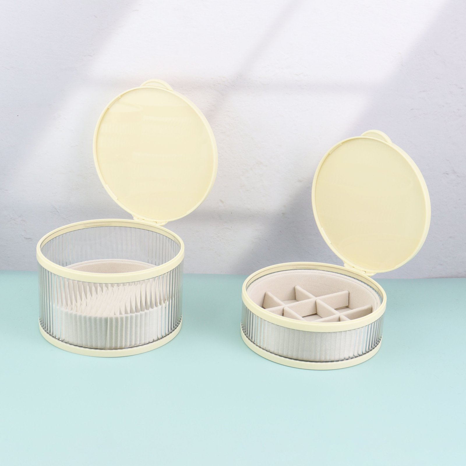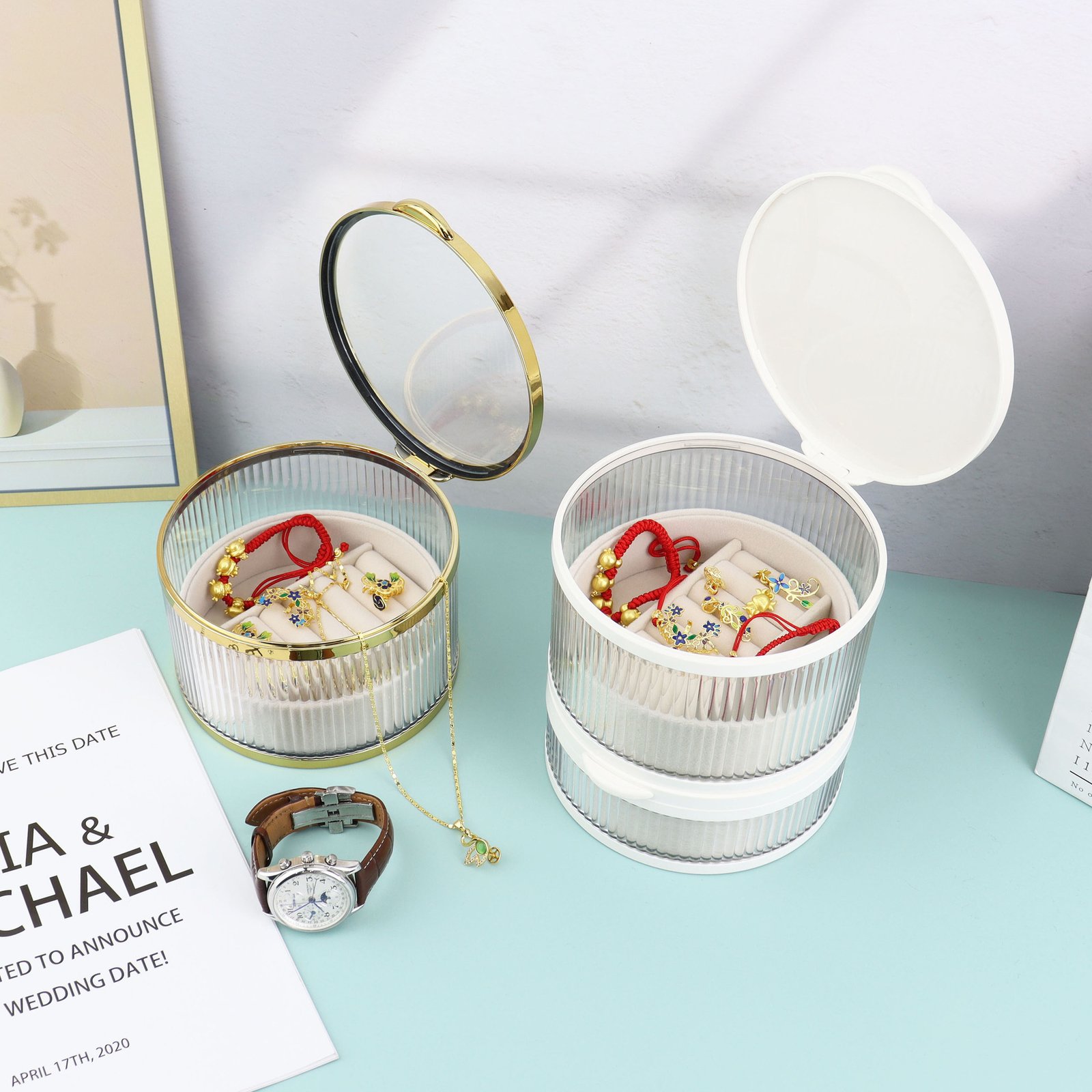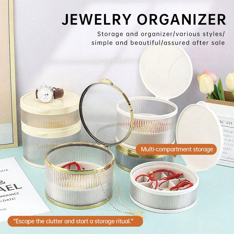This Custom Round Multi-Layer Jewelry Box is crafted from durable ABS and glass, offering a stylish and dustproof organizer for earrings, necklaces, and other small delicate accessories.